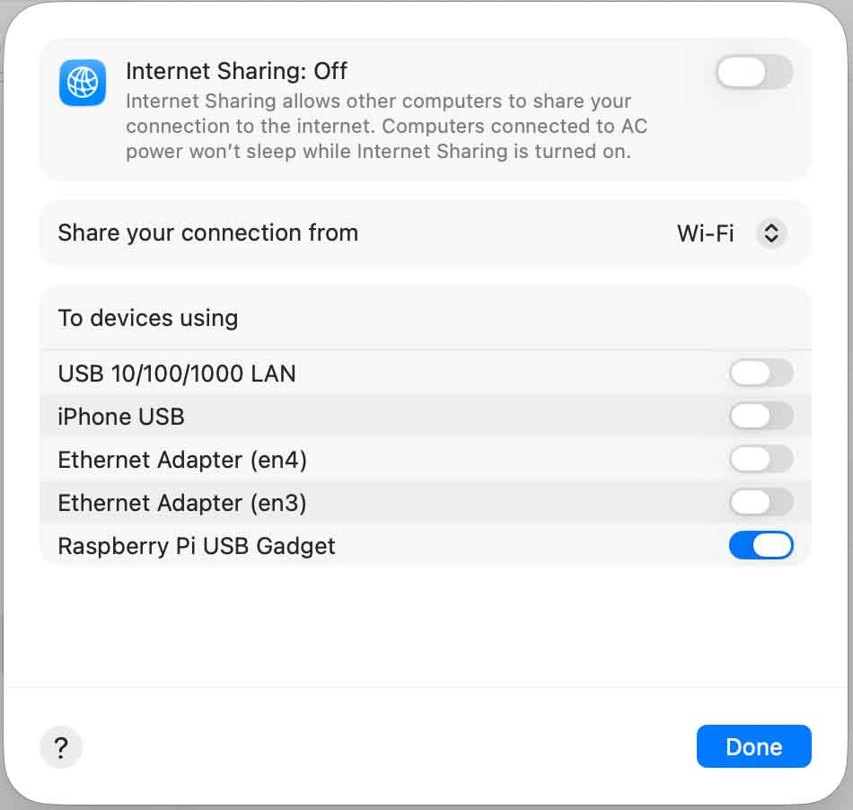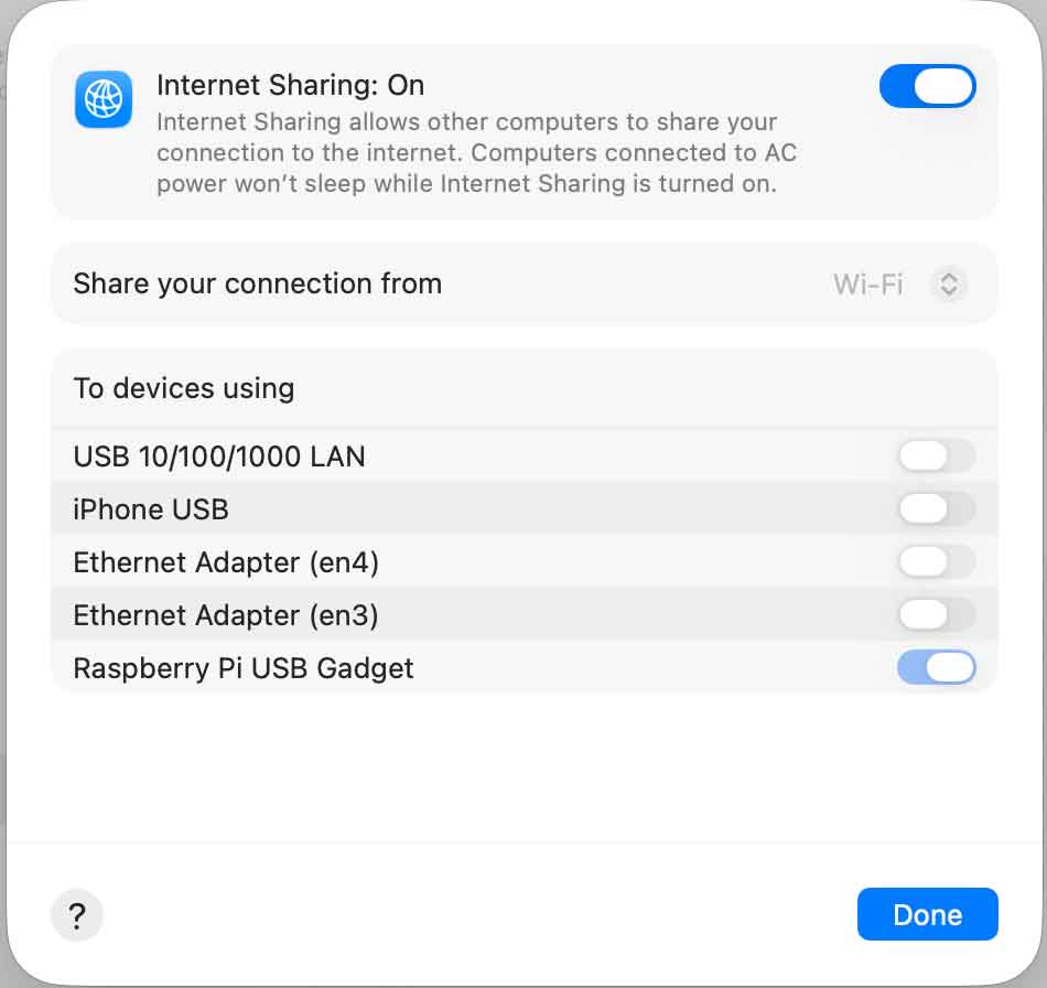 使用你发行版的NetworkManager或等效工具,启用从你的主要互联网连接到树莓派USB Gadget网络接口的路由和NAT。具体说明因桌面环境或初始化系统而异。