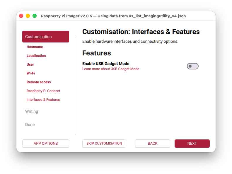 从2025年10月20日及之后发布的Raspberry Pi OS Trixie镜像开始,系统默认包含一个名为rpi-usb-gadget 的新软件包。只需在树莓派镜像工具中切换一个开关即可启用它,这使得USB网络设置变得极其简单。